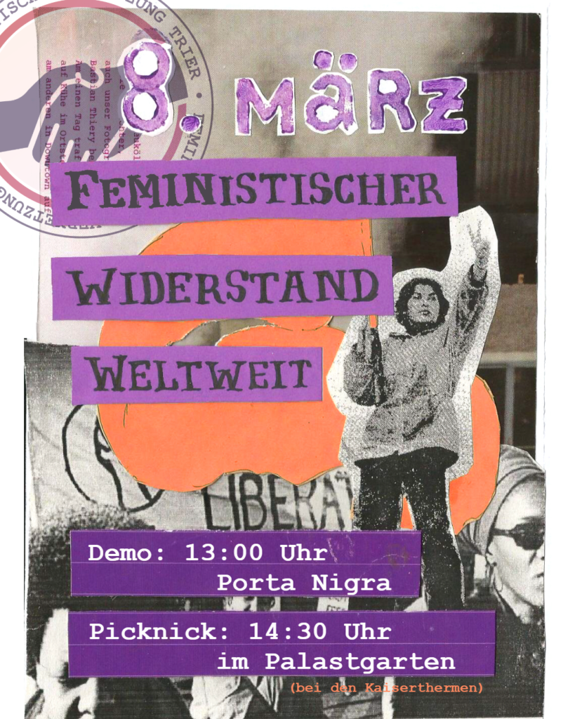 Deshalb laden wir euch am 8.3. zu unserer Demonstration und einem internationalistischen Picknick ein. Bringt gern euer Wissen und eure Geschichten mit, wo ihr selbst, eure Freund*innen und Familien oder eure Geschwister im Kampf widerständig waren oder immer noch Widerstand leisten. Schreibt es auf Papier, malt oder zeichnet die Kämpfe, bringt Sprachnachrichten oder Lieder mit oder bereitet einen Redebeitrag vor. Wir treffen uns um 13:00 Uhr an der Porta Nigra und laufen von dort zum Palastgarten, wo wir ab 14:30 Uhr all unser Wissen über feministische Kämpfe weltweit zusammentragen wollen. Wir wollen mit euch lernen, singen, tanzen und essen. Wir wollen die Kraft des Widerstands zusammen spüren.